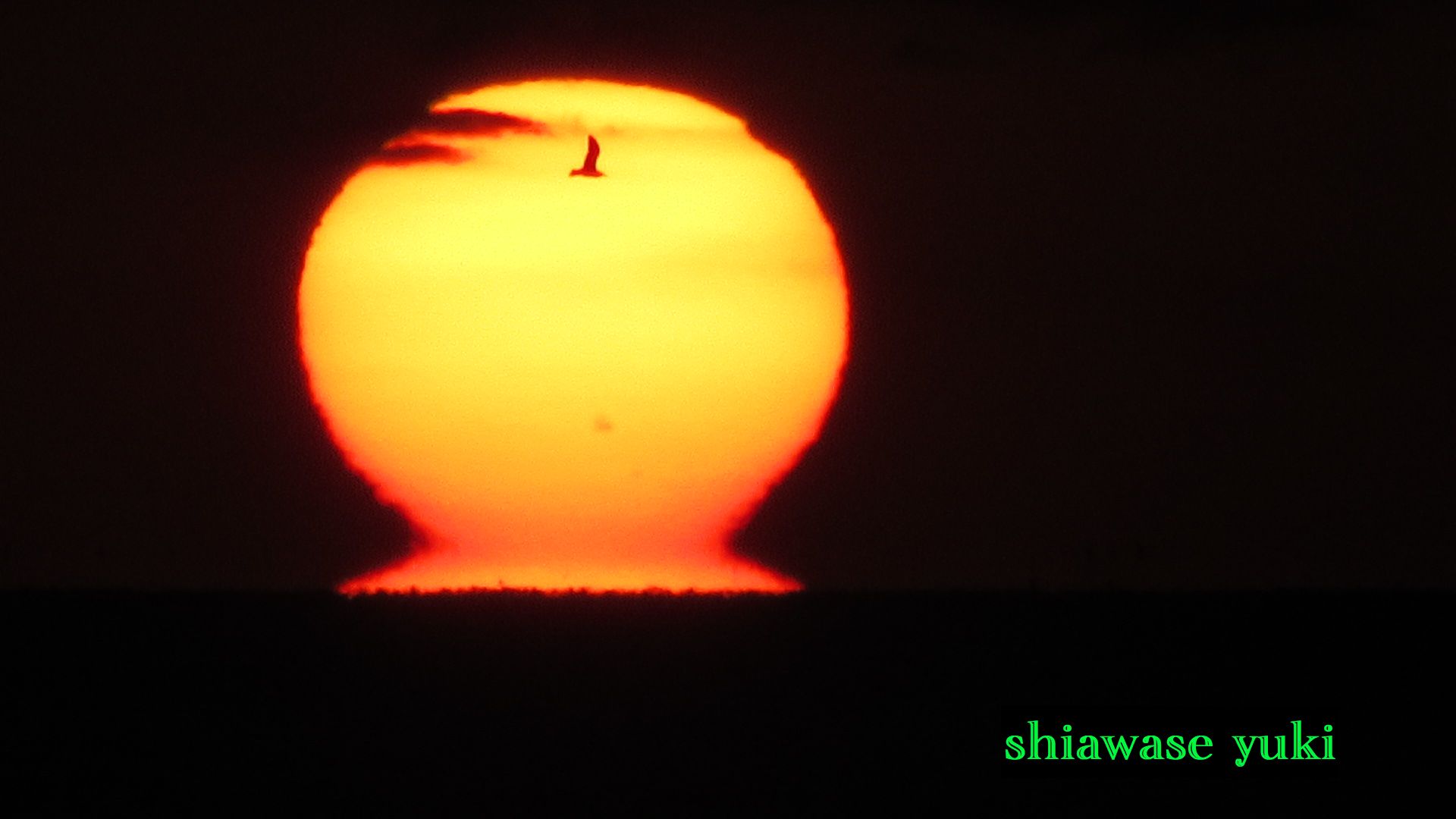 なかなかだるま夕陽も撮れない中、たまたまの1枚にカモメらしき鳥が映り込んでいた。