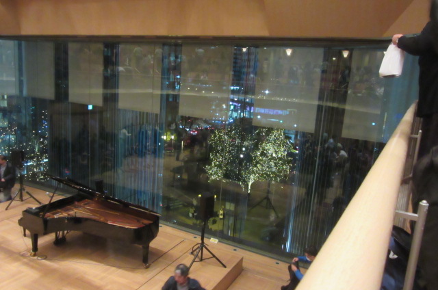 | 二時間あまりにライブのラスト。曲が最高潮になり、ガラスの外には御堂筋の夜景が。 |
