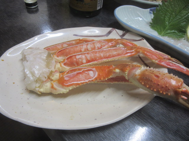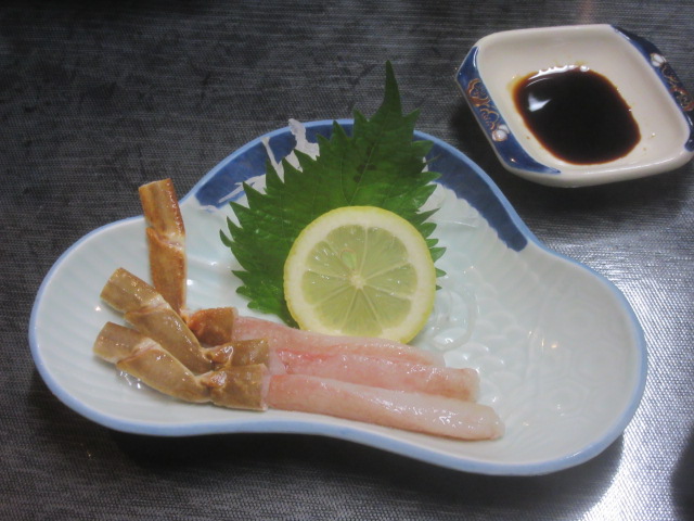 | 先ずは別料金のカニ刺しです\(^_^)/ 口の中で溶けて仕舞いました。もうひとつ頼んでおけば、良かった(^^)/~~~ 焼カニは辛い(^_^;) |