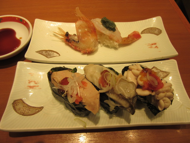 上野駅の食堂街の一角で、お寿司を頂きました。三色軍艦巻とボタンエビの握りです。