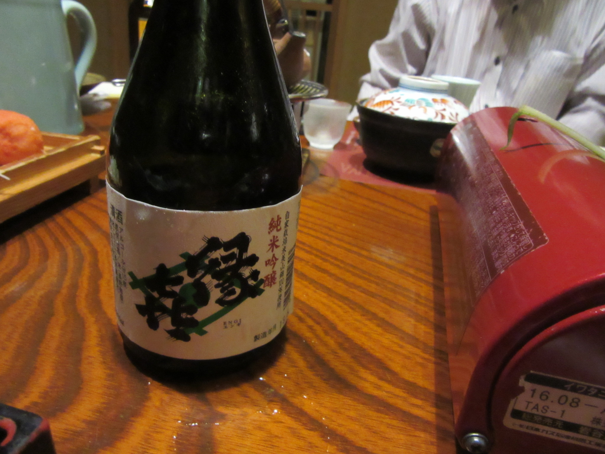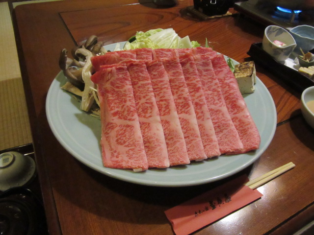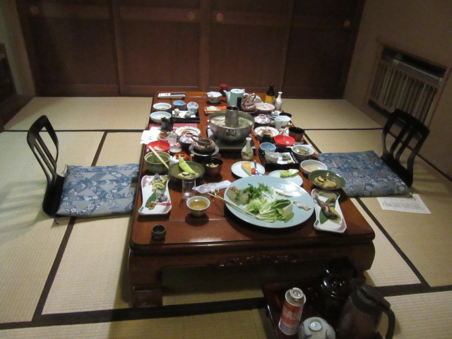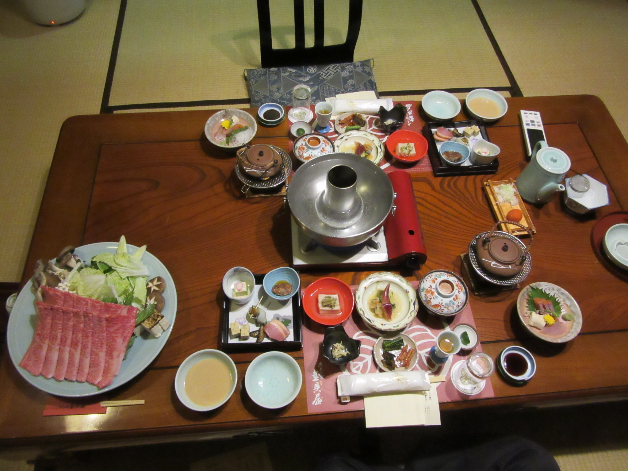 | この宿最高級の食事。『りんごで育った信州牛のしゃぶしゃぶプラン』に、冷酒700ml。完食の意気込みでしたが、その量に完敗です。 |