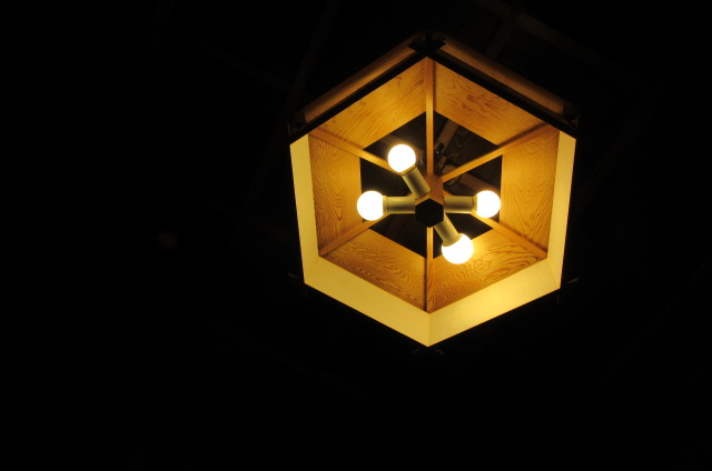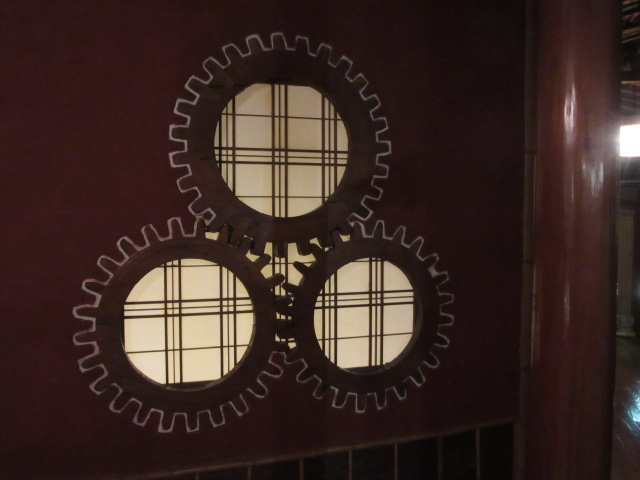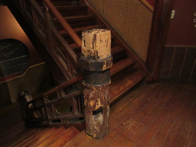 | 宮大工が建てた建物内部。水車の廃材利用して、廊下や階段の一部に使用されています。灯りも最低限に抑えてあり雰囲気満天。 |