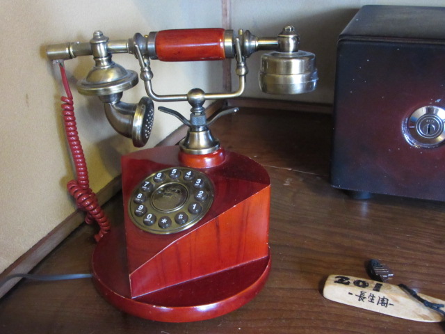 | インテリアの電話? と思いきや、ちゃんと使えました。天井の灯りも良いですね。大の字で一休み。 |