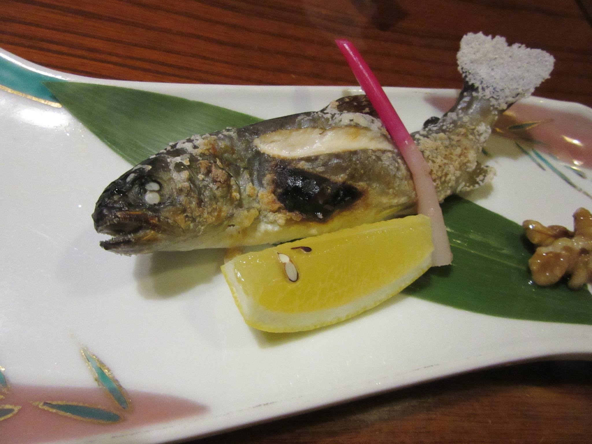 | 岩魚の塩焼きも丸々肥ってて、塩味も完璧。デザートもごちそうさまでした。ごはんと味噌汁などは、事前にお断りしました。 |