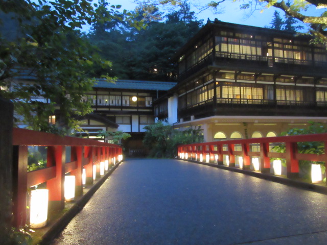 | 陽が沈み、赤い橋に灯りが灯ります。幻想的な雰囲気と、『点と千尋の神隠し』の世界へ今居るのか、、、と。息を止めて、目を閉じて。 |