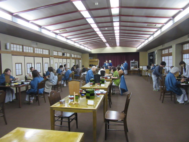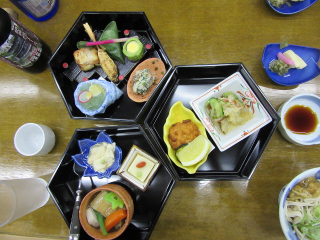 | ここの夕食は大広間。重箱タイプの弁当。山菜主体で薄味。難点は御飯が硬すぎた事。これから『お粥』にするの? |