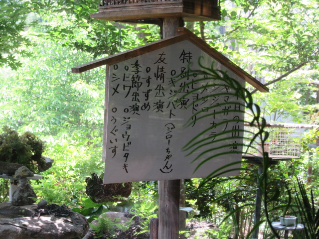 | 窓の外の立て札。店内には色んな小鳥のさえずりが流れてるけれど、別だって。たまにここへ遊びに来る程度だって。 |