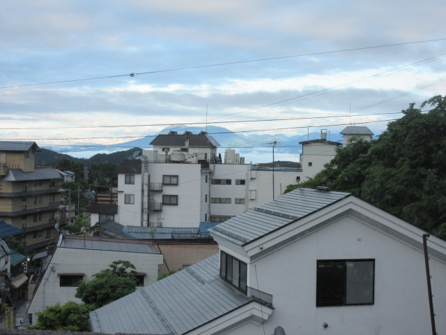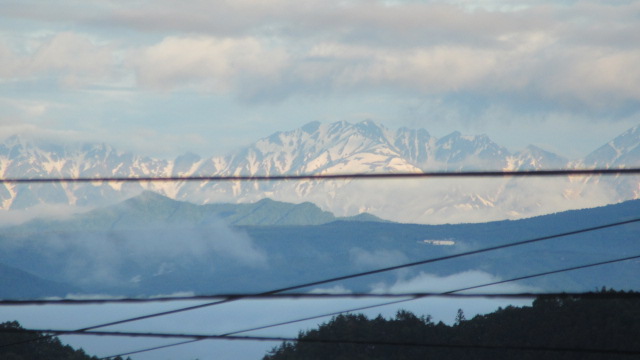 | 4時22分。窓を開けて、ホッとする。雨音かと思ってたら川のせせらぎ。遠く北アルプスが見える。 |