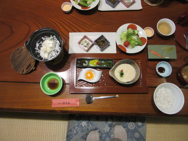 | 7時からの食事。朝食? 他の旅館の夕食並みのバリエーションです。たっぷり頂きました。その後玄関先で宿をバックに記念撮影(^_^)v |